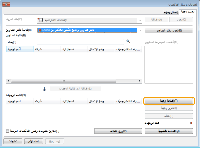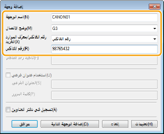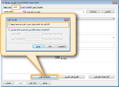 إذا قمت بتحديد [تأكيد رقم الفاكس/معرّف الموارد الفريد عند ضبط الوجهة] في مربع الحوار الذي يتم عرضه عند النقر فوق [إعدادات الأمان] لعلامة التبويب [خاص]، وأدخل أيضًا رقمًا في [تأكيد رقم الفاكس] أو [تأكيد معرّف الموارد الفريد]. لمزيد من المعلومات، انقر على [تعليمات] على شاشة برنامج تشغيل الفاكس.