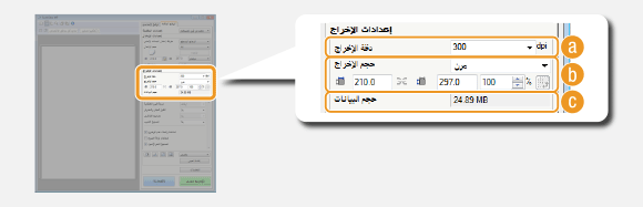 يتم عرض حجم بيانات الصورة عند مسحها ضوئيًا بالضبط على [دقة الإخراج] و[حجم الإخراج].