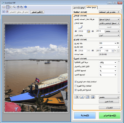 عند النقر فوق علامة التبويب [الوضع المتقدم] على شاشة ScanGear MF، فيمكنك إجراء المزيد من التعديلات المتقدمة في جودة الصورة أكثر من التعديلات التي يمكنك إجراؤها في الوضع "بسيط". كما يمكنك تسجيل الإعدادات المضبوطة كإعدادات مفضلة. لمزيد من المعلومات التفصيلية، انقر فوق الرمز