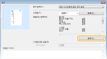 표지에 포함할 항목을 표시합니다. 포함할 항목을 변경하려면 [설정]을 클릭합니다.