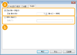 송신하는 매수를 표지에 포함하려면 이 확인란을 선택하고 [전송 매수]에서 매수를 지정합니다. 송신 매수는 자동으로 카운트되지 않습니다. 여기에 지정된 값은 표지에 포함됩니다.