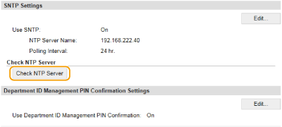 You can view communication status with the registered server by clicking [Settings/Registration]  [Network Settings]  [TCP/IP Settings] and then clicking [Check NTP Server] in [SNTP Settings] that appears. If a proper connection has been established, the result is displayed as shown below. Note that this operation does not adjust the system clock.