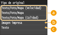 Puede seleccionar la calidad de imagen óptima para la copia en función del tipo de documento, como por ejemplo documentos de solo texto, documentos con tablas y gráficos o fotos de revistas.