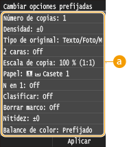 <Menú>  <Opciones de copia>  <Cambiar opciones prefijadas>  Seleccione la opción  Cambie el valor predeterminado del elemento seleccionado  <Aplicar>