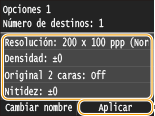 Podrá registrar hasta 18 combinaciones de opciones de fax que utilice con frecuencia. Podrá ver rápidamente las opciones registradas cuando sea necesario, eliminando la necesidad de configurar las mismas opciones cada vez, como puede ser la "realización de un escaneado de un original de dos caras, envío de éste a 5 destinos, y ajuste de la nitidez". También podrá visualizar las opciones como botones de acceso directo en la pantalla <Inicio>.