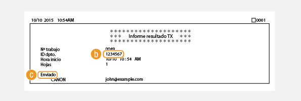 En el e-mail, Informe resultado TX indica el resultado de transmisión entre el equipo y el servidor de correo, no entre el equipo y la dirección de destino. Aunque la transmisión no se realice correctamente, no se imprimirá ningún código de error de tres dígitos. Para consultar el código de error, imprima un Informe de gestión de comunicaciones (