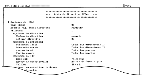 Puede consultar la lista de nombres de directivas y las opciones de IPSec registradas en el equipo imprimiendo una Lista de directivas IPSec.