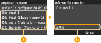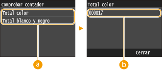 Puede consultar por separado los totales del número de páginas utilizadas para las impresiones en color y las impresiones en blanco y negro. Estos totales incluyen faxes, informes y listas, además de copias e impresiones de datos desde ordenadores.
