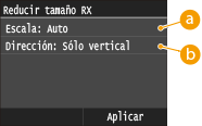 Especifique las opciones para reducir el tamaño de imagen de un documento recibido. Puede seleccionar una escala de reducción automática que reduzca el documento recibido al tamaño del papel cargado. Asimismo, puede seleccionar una escala de la lista.