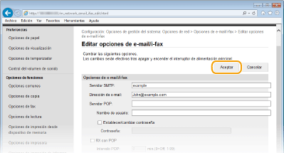 Utilice la IU remota para configurar las opciones detalladas de envío y recepción, como pueden ser las opciones para utilizar el equipo para enviar y recibir I-Faxes y las opciones para la autenticación de POP y el cifrado antes de enviar e-mail o I-Faxes. Póngase en contacto con su proveedor o administrador de red para obtener la configuración necesaria.