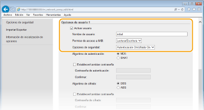 Si ambas versiones de SNMP están habilitadas, se recomienda establecer el permiso de acceso a MIB de SNMPv1 en [Sólo lectura]. El permiso de acceso a MIB puede establecerse de forma independiente en SNMPv1 y SNMPv3 (y para cada usuario en SNMPv3). Si selecciona [Lectura/Escritura] (permiso de acceso completo) en SNMPv1 se invalidan las sólidas opciones de seguridad que caracterizan a SNMPv3, ya que la mayoría de las opciones del equipo pueden controlarse con SNMPv1.