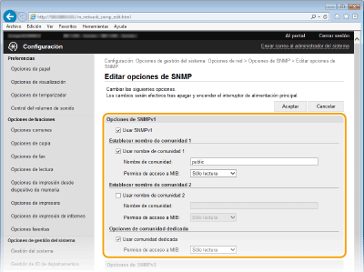 Si no necesita cambiar las opciones de SNMPv1, continúe con el siguiente paso.