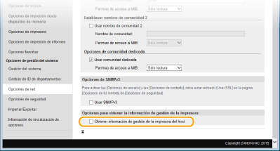 Especifique las opciones de adquisición de información de gestión de la impresora.