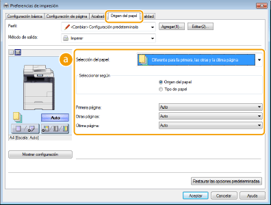 Seleccione las páginas que desee imprimir en un papel diferente y el origen del papel cargado con el papel en [Selección del papel]