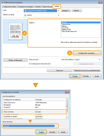Pestaña [Calidad] Seleccione el tipo de documento en [Objetivo] Haga clic en [Configuración avanzada] Seleccione [Ahorro de tóner] en la pantalla [Configuración avanzada] Seleccione [Activado] en la lista desplegable [Aceptar] [Aceptar]