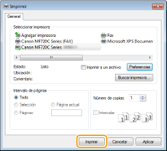 El método para mostrar el cuadro de diálogo de impresión varía según la aplicación. Para obtener más información, consulte el manual de instrucciones de la aplicación que esté utilizando.