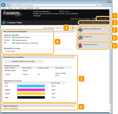 Muestra el enlace de asistencia especificado en [Información del dispositivo] debajo de [Gestión del sistema].