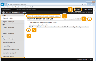 Muestra el estado de los documentos de impresión actuales y el historial de impresión, copia, envío y documentos recibidos. Asimismo, puede consultar el estado del equipo.
