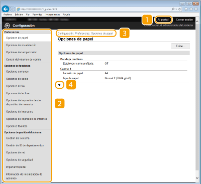 Muestra la página [Configuración]. Cuando haya iniciado sesión en el modo Administrador del Sistema, podrá cambiar los elementos de configuración y guardar/cargar los datos registrados.