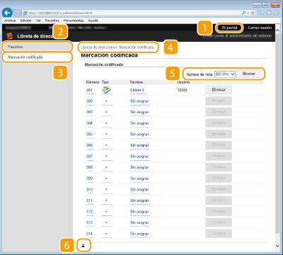 Especifica el rango de números de marcación codificada que aparece en la página. No puede visualizar Número de lista en Favoritos.