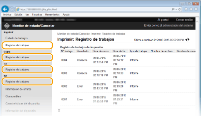 Se mostrará el historial de impresión, copia, envío de faxes/e-mails (TX) o recepción de faxes (RX).