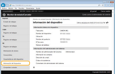 Se muestra la información sobre el equipo y el administrador del sistema. Esta información está establecida en [Gestión del sistema] en la página [Configuración].