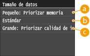 Los documentos escaneados se convierten en los formatos de archivo especificados. En ese momento, puede especificar la escala de compresión del archivo. <Pequeño: Priorizar memoria> aumenta la escala de compresión más de lo normal para crear archivos más pequeños con una calidad de imagen inferior. Por otro lado, <Grande: Priorizar calidad de imagen> reduce la escala de compresión más de lo normal para crear archivos más grandes con una calidad de imagen superior.