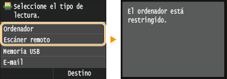 ![]() Si la casilla de verificación [Lectura] está marcada, las funciones Guardar a dispositivo de memoria USB, Enviar e-mail y Guardar en carpeta compartida o servidor de FTP estarán todas restringidas. También podrá restringir otros métodos para escanear documentos importándolos a un ordenador pero, en ese caso, no podrá bloquear el acceso para cada ID de departamento (Bloqueo de trabajos cuando el ID de departamento es desconocido).
