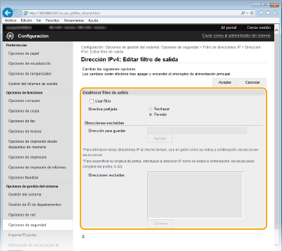Si las direcciones IP se introducen de forma incorrecta, es posible que no pueda acceder al equipo desde la IU remota, en cuyo caso deberá establecer <Filtro de direcciones IPv4> o <Filtro de direcciones IPv6> en <Off>. Filtro de direcciones IPv4 Filtro de direcciones IPv6