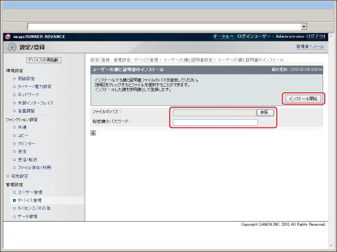 リモートUIからユーザーの鍵と証明書リストをインストールする操作は、管理者が一括して行うことができません。ユーザーが各自で行う必要があります。