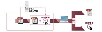 タイムスタンプサーバーより発行されるタイムスタンプトークン(時刻署名が行われた署名情報のようなもの)を用いてスタンプを行うことによって、PDFデータがスタンプされた時刻に存在していたことを証明します。