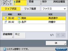 デフォルト画面の変更(状況確認/中止)を[送信]、[ジョブ状況]、[ファクス]に設定している場合