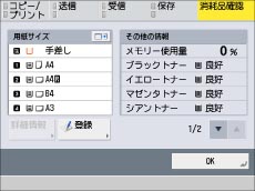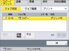 (状況確認/中止)を押すと、状況確認/中止画面が表示されます。状況確認/中止画面では、システムの状況の確認やジョブの中止、優先プリントの指定などを行うことができます。