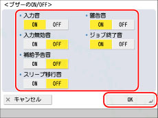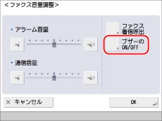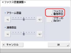 (音量調整)を押して、ファクス送信・受信のアラーム音量と通信音量を調整できます。また、ファクス着信時の呼び出し音を設定したり、操作やデバイスの状態に応じてさまざまな種類のブザーが鳴るように設定できます。