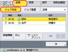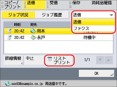 送信ジョブリストには、ファクス、Eメール、Iファクス、ファイルサーバーの宛先に送信するジョブが表示されます。