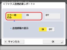 本設定を「ON」にしてファクス同報送信を行った場合、ファクスマルチ送信結果レポートが出力されます。(→ファクスマルチ送信結果レポート)
