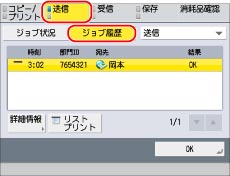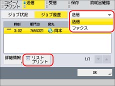 ファクス通信管理レポートの送信履歴をプリントする場合は、ドロップダウンリストで[ファクス]を選択します。(→ファクス通信管理レポート)