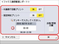 ファクス通信管理レポートを自動でプリントする場合は、40件の文書の送信/受信が終了した時点でプリントするか、指定した時刻にプリントするかを選択できます。また、送信/受信別にプリントすることもできます。