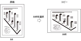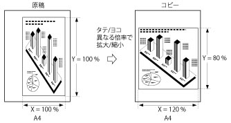 指定した用紙サイズにあわせて、自動的に原稿を拡大/縮小してコピーできます。倍率はタテ/ヨコ同率です。