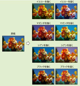 原稿の色を全体的に少し変えたいとき、カラーバランスを調整してコピーできます。
