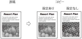 「写真」モードを使用して、印刷写真などのように網点からなる原稿をコピーすると、モアレと呼ばれるまだら模様が出ることがあります。「弱く」を使用してコピーすると、このようなモアレ現象を弱めます。