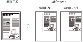 原稿が指定した用紙サイズより小さいとき、読み込んだ画像の周囲にできる影や枠線を消してコピーします。読み込んだ画像の周囲に一定幅の余白(白地)を作ってコピーすることもできます。