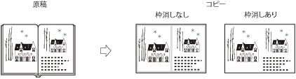 雑誌や本などが原稿のとき、コピーする原稿の周囲や中央にできる影や枠線を消してコピーします。