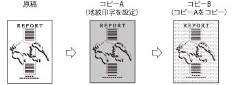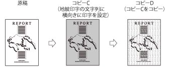 [地紋印字]を設定すると、コピーしたときに、白抜きで表れる文字を出力紙の背景に埋め込みます。