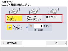 [自動ソート]が「ON」のときは、原稿をフィーダーにセットした時点で、自動的にソートまたはシフト(ずらし)ソートが設定されます。(→自動ソートを有効にする)
