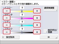 各色の濃度を調整するときは[濃度微調整]を押します。濃度を調整する色を選択して、[-][+]で濃度域別に強弱を調整したあと、[OK]を押します。