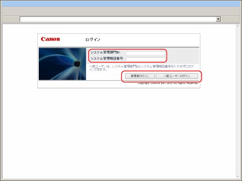 ログインサ-ビスについては、「MEAP認証システム設定」を参照してください。認証機能を設定していない場合は、ログイン画面は表示されません。