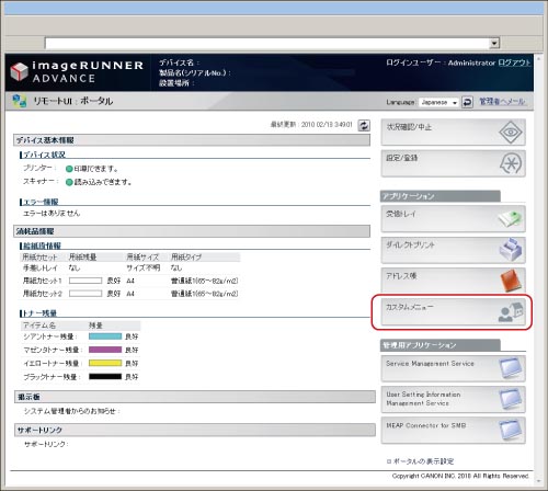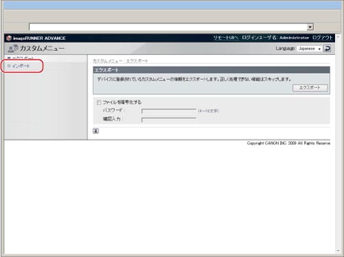 インポートしたファイルの利用は、同一機種グループ間(imageRUNNER ADVANCE C2030/C2030F/C2020/C2020F)で有効です。ただし、オプションの装着状態や使用環境の違いによって、インポートしたボタンを利用できない場合があります。