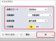 リモートFAX送信キットを有効にしてファクス機能を使用する場合、<ECM送信>、<送信スピード>、<国際送信>については、リモートファクスサーバー側の設定に従って送信されます。