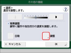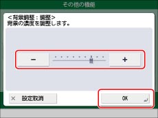 <背景調整>の[調整]を押して調整値を変更すると、<背景調整>の[自動]は解除されます。また、<背景調整>で濃度調整をしているときに<濃度>の[自動]を押すと、調整値は解除され、下地の画質を自動的に調整します。